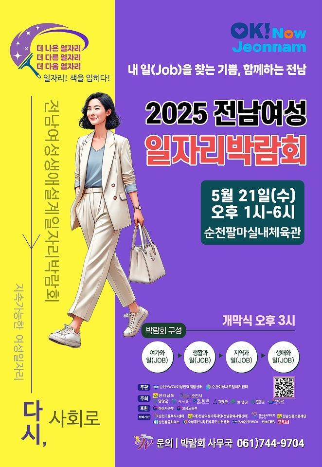 이번 박람회는 전라남도와 순천시가 공동 주최하며, 순천YWCA여성인력개발센터 주관으로 진행된다. '내 일(Job)을 찾는 기쁨, 함께하는 전남'을 슬로건으로 진행되는 이날 박람회는 변화하는 일자리 패러다임에 맞춰 여성의 생애주기별 맞춤형 일자리 정보를 제공하고, 재취업과 창업 등 다양한 경로를 통해 여성의 사회참여 기회를 확대하기 위해 마련됐다.