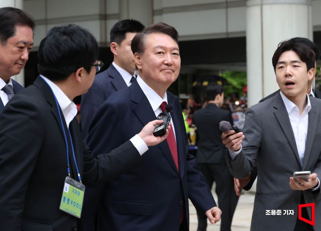 윤석열 전 대통령이 19일 서울 서초구 중앙지방법원에서 열린 내란 우두머리 혐의, 직권남용 권리행사방해 혐의 사건 4차 공판을 마친 뒤 법정을 나서고 있다.