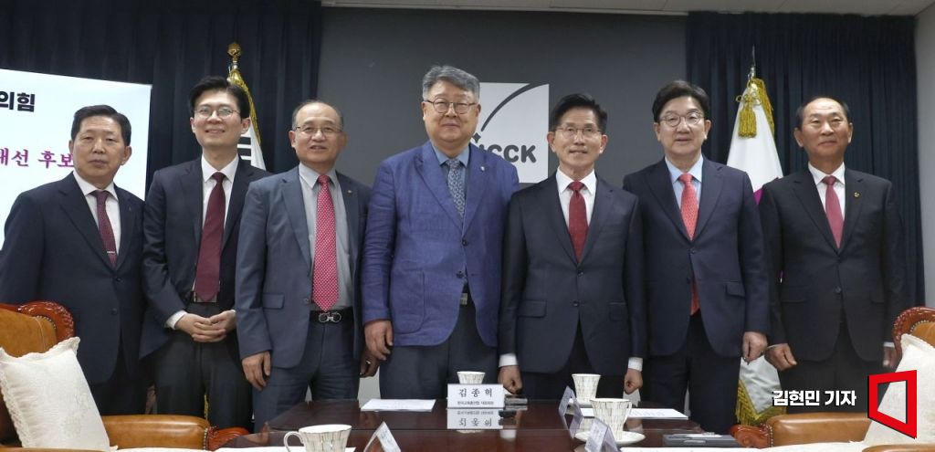 김문수 국민의힘 대선후보가 19일 서울 종로구 기독교회관을 찾아 김종혁 한국교회총연합회 회장(가운데)등 간부들과 이념촬영을 하고 있다.