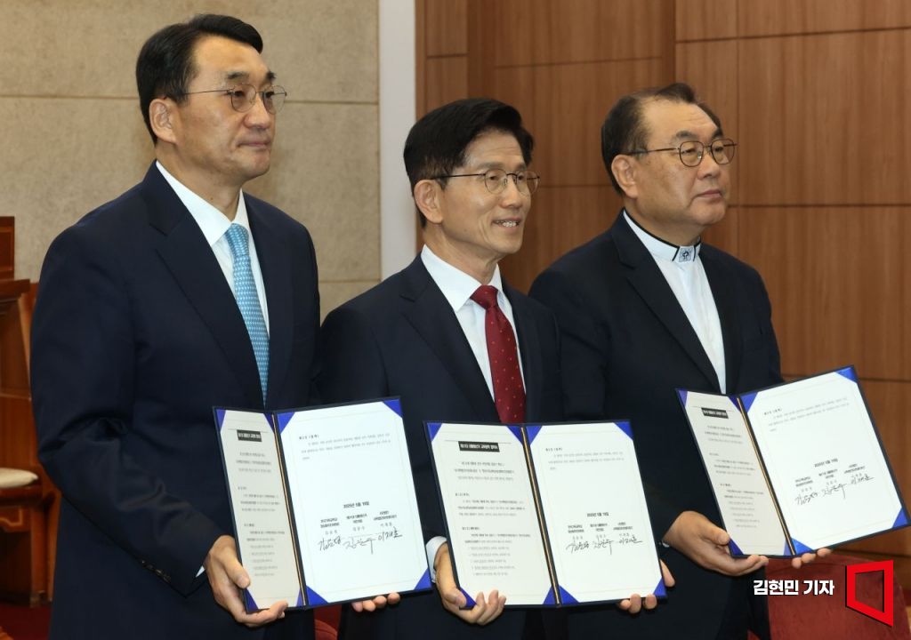김문수 국민의힘 대선후보(가운데)와 이재훈 미션네트워크 이사장(왼쪽), 김운성 한국기독교학교정상화추진위원장이 19일 서울 종로구 한국기독교회관에서 열린 '한국기독교학교정상화추진위원회-김문수 국민의힘 대통령 후보-사학법인미션네트워크 교육정책협약식'에서 기념촬영을 하고 있다.