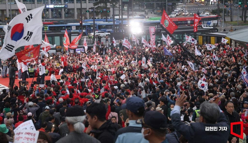 김문수 국민의힘 대선 후보가 19일 서울역 광장에서 열린 '쏘울을 새롭게' 집중 유세에서 시민들에게 지지를 호소하고 있다.