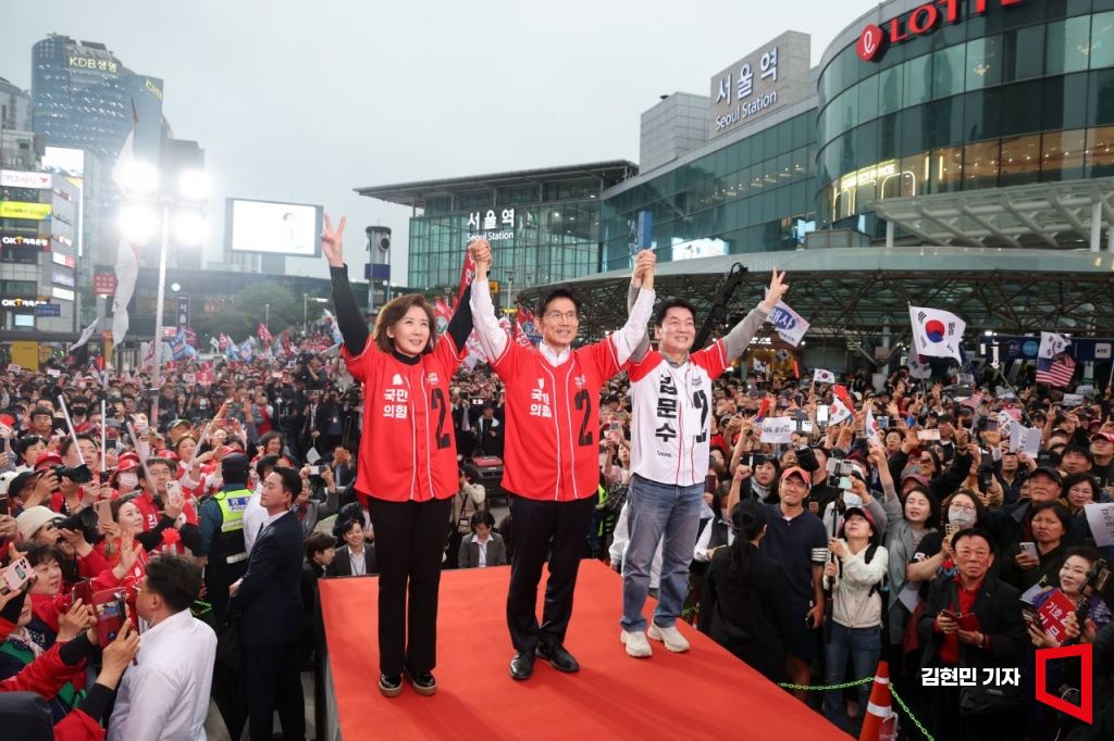 김문수 국민의힘 대선 후보가 19일 서울역 광장에서 열린 '쏘울을 새롭게' 집중 유세 현장에서 나경원, 안철수 의원과 손을 맞잡고 지지를 호소하고 있다.