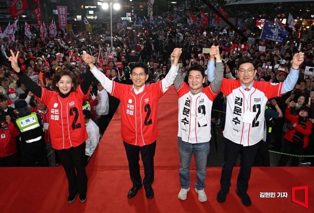 김문수 국민의힘 대선 후보가 19일 서울역 광장에서 열린 ‘쏘울을 새롭게’ 유세에서 권성동 원내대표와 나경원, 안철수 공동선대위원장과 함께 유권자들에게 손을 들어보이며 인사하고 있다.
