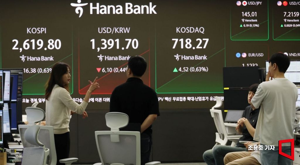 20일 서울 중구 하나은행 본점 딜링룸에서 직원들이 증시와 환율을 지켜보고 있다. 이날 오전 9시 2분 현재 코스피 지수는 전장보다 16.11포인트(0.62%) 오른 2,619.53 출발해 상승세를 이어가고 있다.