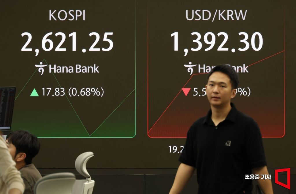 20일 서울 중구 하나은행 본점 딜링룸에서 직원들이 증시와 환율을 지켜보고 있다. 이날 오전 9시2분 코스피 지수는 전장보다 16.11포인트(0.62%) 오른 2619.53 출발해 상승세를 이어가고 있다. 조용준 기자