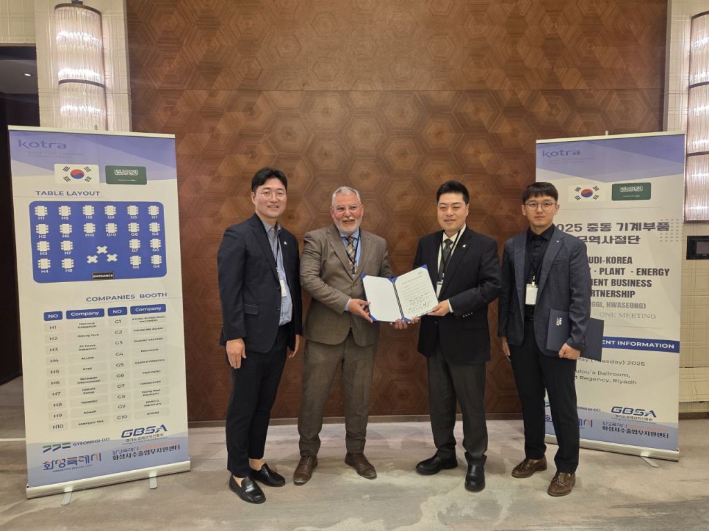 화성시가 올해 중동지역에 파견한 시장개척단이 1800만달러의 상담 실적을 거뒀다. 시장개척단에 참여한 한성하나론의 허욱 대표(오른쪽 두번째)가 사우디아라비아 리야드 수출상담회에서 현지 바이어와 양해각서(MOU)를 체결하고 있다. 화성시 제공