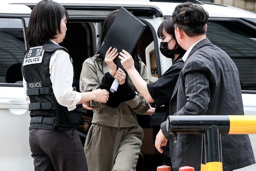 축구 국가대표팀 주장 손흥민의 아이를 임신했다고 주장하며 손흥민에게 돈을 뜯어내려 한 20대 여성 양모씨(왼쪽)가 17일 영장실질심사를 받기 위해 서울중앙지법에 들어서고 있다. 연합뉴스
