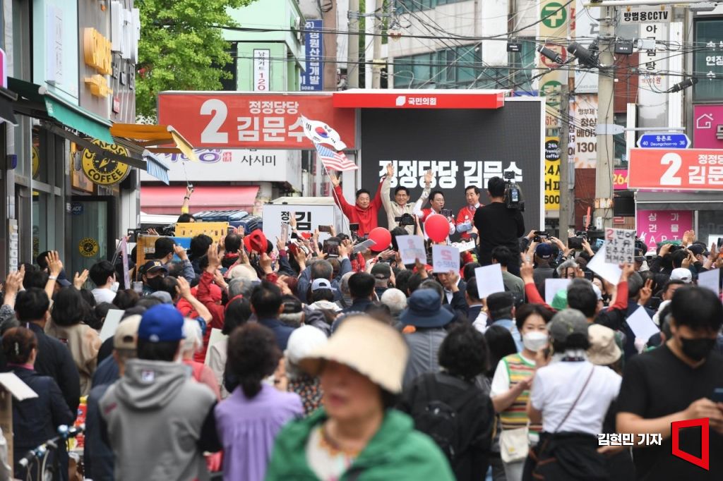 김문수 국민의힘 대선 후보가 20일 서울 강서구 화곡동 남부골목시장에서 시민들을 향해 지지를 호소하고 있다.