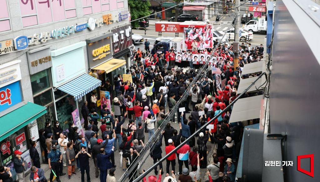 김문수 국민의힘 대선 후보가 20일 서울 강서구 화곡동 남부골목시장에서 시민들을 향해 지지를 호소하고 있다.