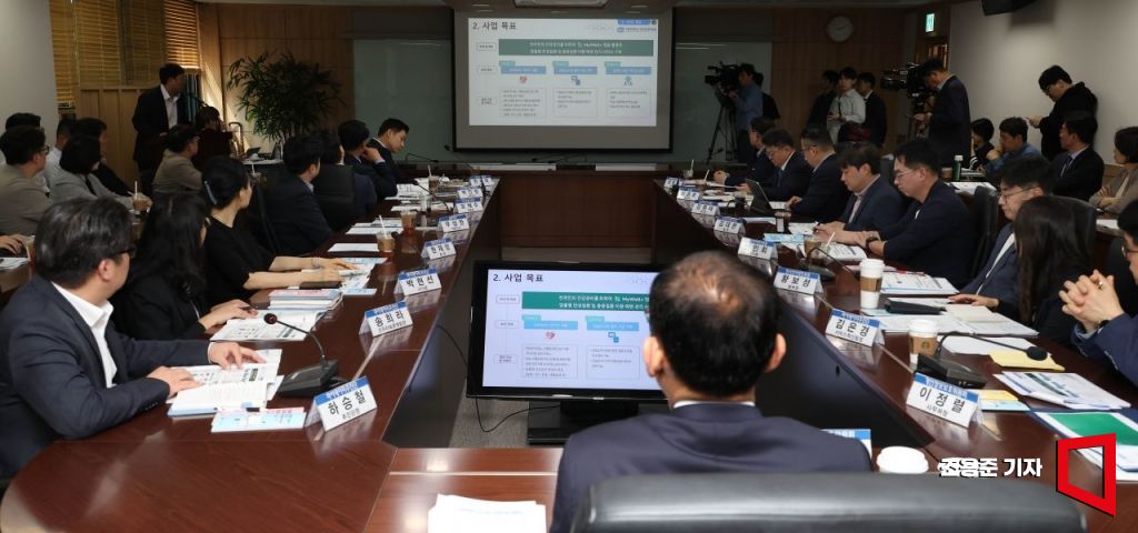 고학수 개인정보위원장을 비롯한 참석자들이 20일 서울 종로구 정부서울청사 개인정보보호위원회에서 열린 마이데이터 선도서비스 시연회에서 가톨릭중앙의료원의 서비스 시연을 지켜보고 있다.
