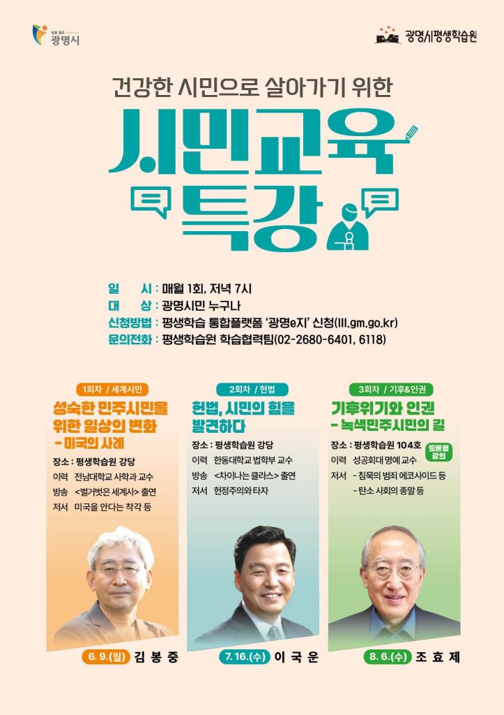 첫 강연은 다음 달 9일 광명시 평생학습원 강당에서 열린다. 김봉중 전남대 사학과 교수가 '성숙한 민주시민을 위한 일상의 변화-미국의 사례' 주제로 일상 속 민주주의 실천 방안을 함께 모색한다.