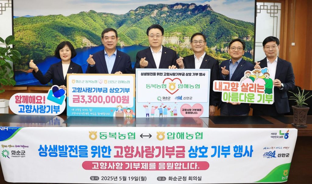 화순군(군수 구복규)은 지난 19일 동복농협(조합장 김정수)과 신안 압해농협(조합장 천성태)이 화순군청에서 고향사랑기부금 상호기부 기탁식을 통해 지역 간 상생발전을 위한 협력 체계 구축에 나섰다고 20일 밝혔다.