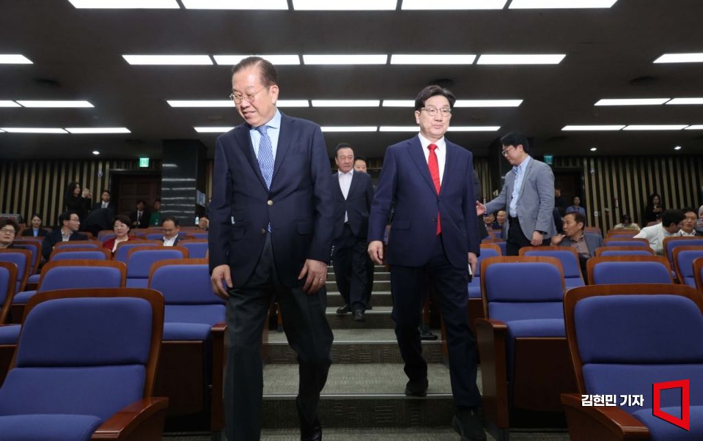 권영세 국민의힘 비상대책위원장과 권성동 원내대표가 8일 국회에서 열린 의원총회에 참석하고 있다. 2025.5.8김현민 기자