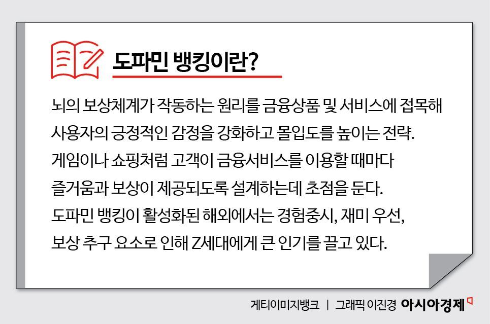 도파민 뱅킹은 인간이 행복을 느끼는 쾌감과 즐거움의 요소를 금융상품, 금융서비스에 접목해 고객의 뱅킹 앱 몰입도를 높이는 전략이다. 게임이나 쇼핑처럼 고객이 금융서비스를 이용할 때마다 즐거움과 보상이 제공되도록 설계하는 데 초점을 둔다. 이는 디지털 환경에 익숙하고 자극과 재미, 보상을 추구하는 Z세대의 특성과도 맞닿아있어 이들의 발길을 붙잡는 효과적인 대안이 될 수 있다고 보고서는 지적했다.