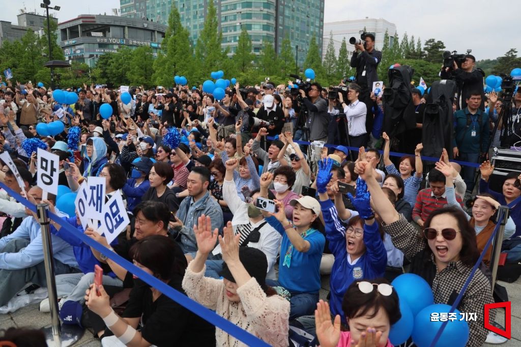 20일 경기 고양시 일산문화광장에서 열린 이재명 더불어민주당 대선 후보 집중 유세 현장에서 지지자들이 환호하고 있다.