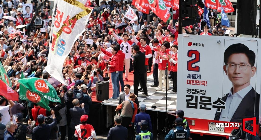 김문수 국민의힘 대선 후보가 20일 서울 서초구 고속터미널 광장에서 집중 유세를 하고 있다.