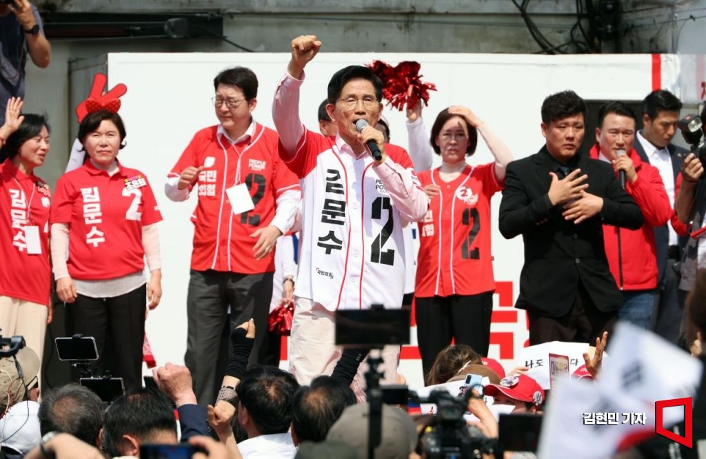 김문수 국민의힘 대선 후보가 20일 서울 서초구 고속터미널 광장에서 유권자들에게 지지를 호소하고 있다.