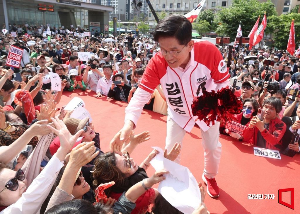 김문수 국민의힘 대선후보와 선대위원들이 20일 서울 서초구 고속터미널 앞 광장에서 열린 집중유세에서 지지자들과 악수하고 있다.
