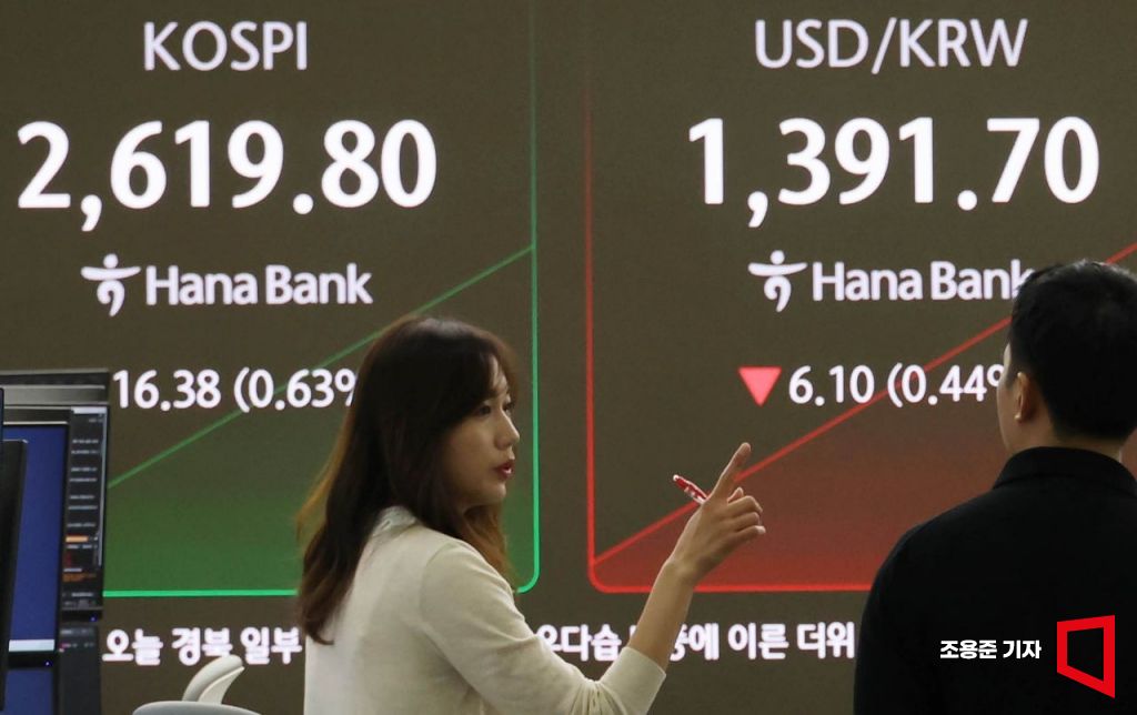 20일 서울 중구 하나은행 본점 딜링룸에서 직원들이 증시와 환율을 지켜보고 있다. 조용준 기자