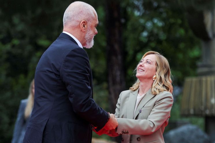 에디 라마 알바니아 총리가 알바니아 티라나에서 열린 유럽정치공동체(EPC) 정상회의에 참석한 조르자 멜로니 이탈리아 총리를 환영하고 있다. 로이터연합뉴스