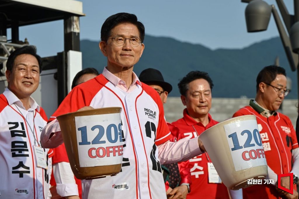 김문수 국민의힘 대통령 후보가 20일 경기 하남시 스타필드 앞에서 열린 집중 유세에서 ‘120원 커피’라고 적힌 화분을 들어보이고 있다.