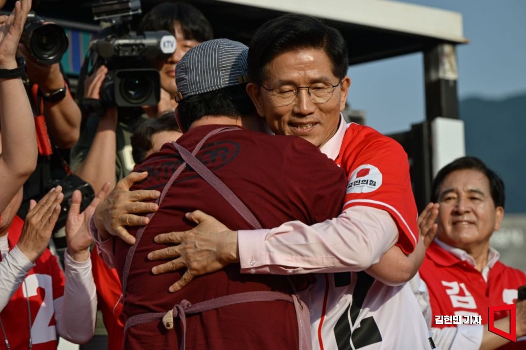 김문수 국민의힘 대선후보가 20일 경기 하남시 스타필드 하남 앞에 마련된 유세 현장에서 하남시에서 카페를 운영하는 자엉엽자의 발언을 듣고 안아주고 있다.