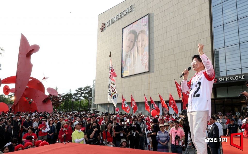 김문수 국민의힘 대선후보가 20일 경기 하남시 스타필드 앞에서 시민들을 향해 지지를 호소하고 있다.
