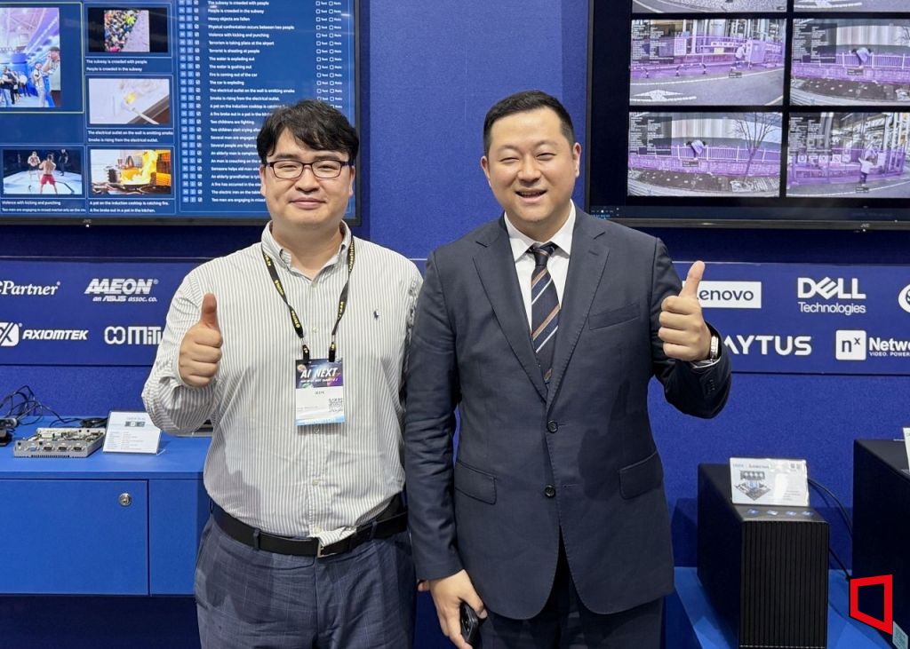 김녹원 딥엑스 최고경영자(CEO)와 채명수 노타 CEO가 20일 대만 타이베이 난강 전시센터에서 열린 '컴퓨텍스 2025' 전시회에서 아시아경제와 인터뷰를 한 뒤 기념촬영을 하고 있다. 장희준 기자