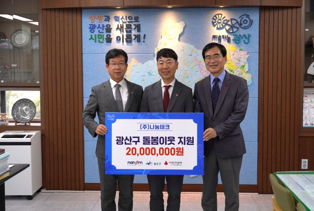 이날 진행한 전달식은 최무진 ㈜나눔테크 대표이사와 박병규 광산구청장, 박흥철 광주사랑의열매 사무처장이 참석했다. 기탁된 성금은 광산구 사회적 고립 가구 해소를 위한 광산구 '1313 이웃 살핌' 사업비로 사용할 예정이다.