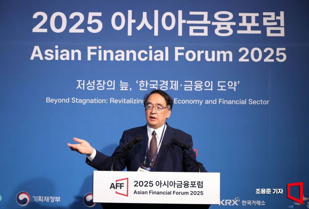 기우치 다카히데 노무라종합연구소 수석 이코노미스트가 21일 서울 중구 웨스턴조선호텔에서 열린 '2025 아시아금융포럼(Asisn Financial Forum 2025)'에 참석, '트럼프 관세와 세계 및 일본경제' 란 주제로 기조연설을 하고 있다.