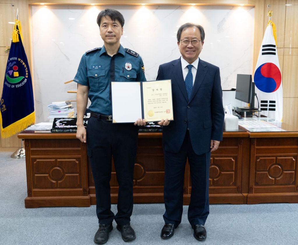 부산시교육청이 초등학교 인근 통학로의 도로 꺼짐 현장을 신속히 발견·조치해 학생 안전사고를 예방한 공로로 현직 경찰관에게 감사장을 수여했다.