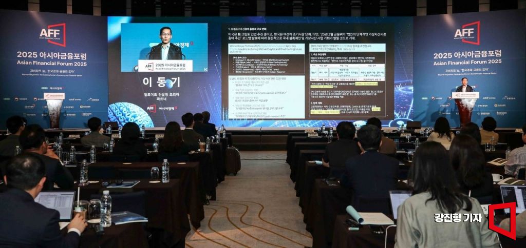 이동기 딜로이트컨설팅코리아 파트너가 21일 서울 중구 조선호텔에서 아시아경제 주최로 열린 '2025 아시아금융포럼'에 참석해 ‘트럼프 2.0 시대, 가상자산 글로벌 동향 및 가상자산 기반 사업화 제언’이란 주제로 특별강연 하고 있다.