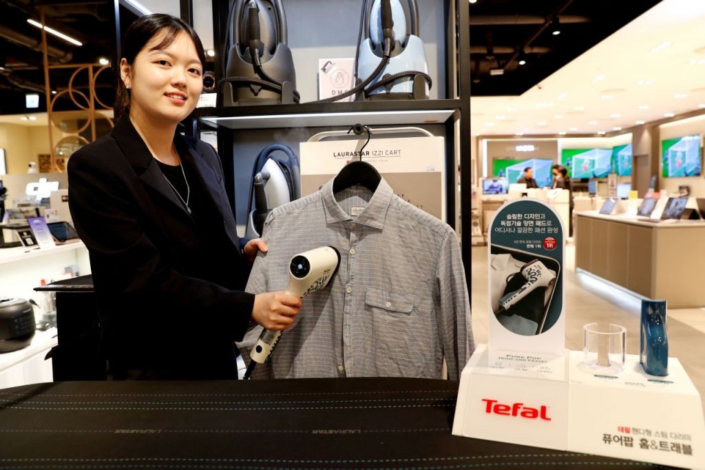 광주신세계 본관 8층 테팔 매장에서 모델이 테팔 핸디형 스팀다리미 퓨어팝 모델을 들고 포즈를 취하고 있다. 광주신세계 제공
