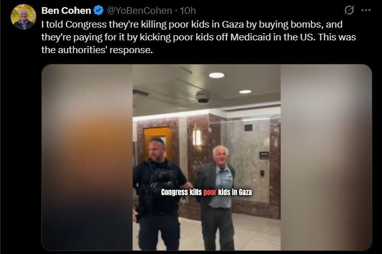 미 상원 청문회 도중 돌발 시위를 벌이다가 붙잡힌 벤 코헨 벤앤제리스 창업자. 벤 코헨 X 캡처