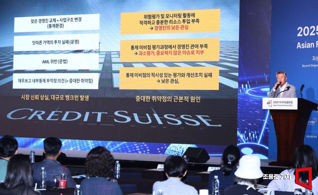윤여현 삼일PwC 파트너가 21일 서울 중구 웨스턴조선호텔에서 열린 '2025 아시아금융포럼(Asisn Financial Forum 2025)'에 참석, '책무구조 시행에 따른 선제적 금융사고 예방과 대응'이란 주제로 강연하고 있다.