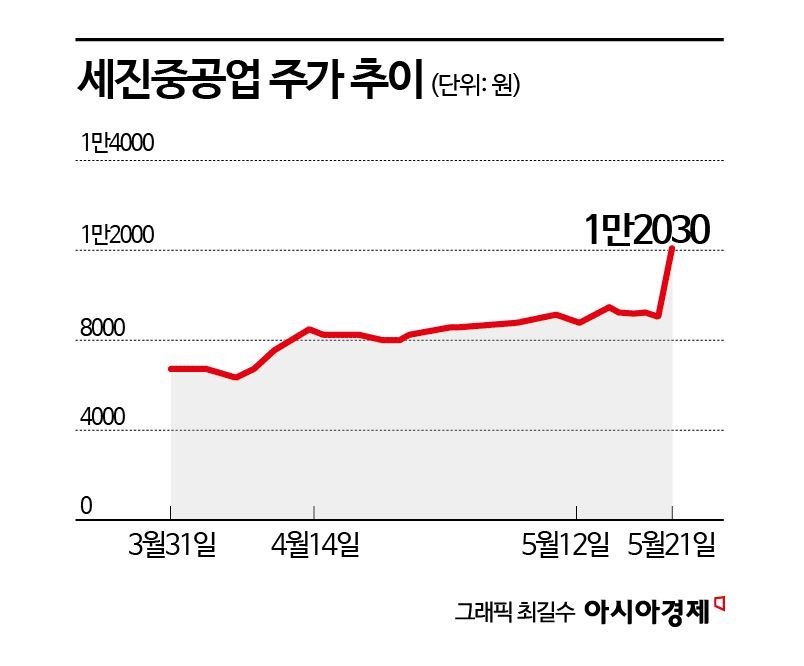 22일 금융투자업계에 따르면 세진중공업 주가는 지난 3월 말 대비 82.8% 상승했다. 같은 기간 코스피가 5.8% 오른 것을 고려해도 시장 대비 수익률은 77%포인트(P)에 달한다. 시가총액은 6840억원으로 불어났다. 이 기간 외국인은 누적 순매수 92억원을 기록했다. 평가 수익률은 27%로 집계했다.
