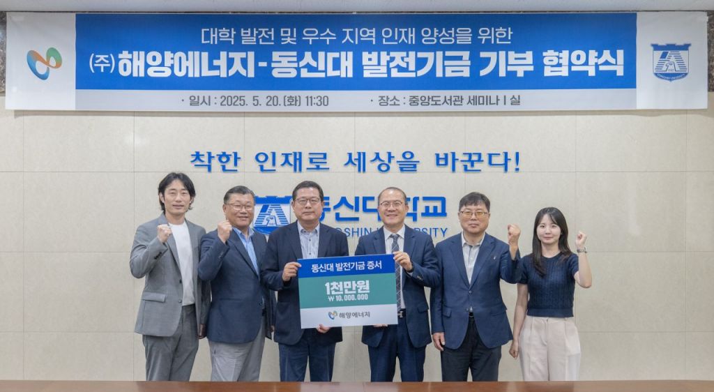 해양에너지는 지난 2021년부터 매년 1,000만 원씩 동신대에 발전기금을 기부해 왔다. 동신대는 에너지신산업 분야를 학문 분야 특성화로 집중적으로 육성하며 에너지산업 분야 인재 양성에 주력해오고 있다.
