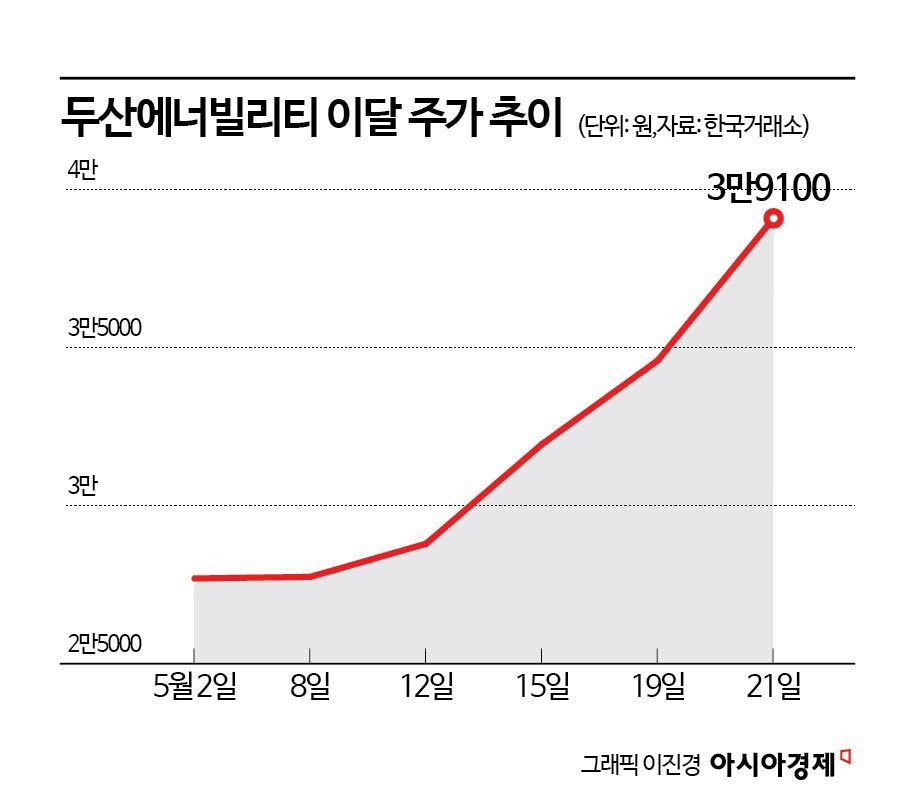22일 한국거래소에 따르면 두산에너빌리티는 전일 5.11% 상승한 3만9100원에 마감했다. 지난 8일부터 10거래일 연속 상승세다. 이날 장중 3만9300원까지 오르며 52주 신고가를 다시 썼다. 올해 초 1만8000원대였던 두산에너빌리티의 주가는 이제 4만원선을 넘보고 있다. 연초 34위였던 시가총액 순위는 13위로 20계단 넘게 뛰어오른 상태다. 11조원대였던 시총은 25조원까지 불어났다.