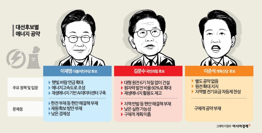 한편 이준석 후보는 에너지 공약을 따로 제시하지 않았다. AI 산업 육성을 내세웠지만 이를 뒷받침할 전력 확보안은 나오지 않았다. TV토론 발언 등을 고려하면 원전에 우호적이지만 구체화가 필요하다는 지적이 나온다.
