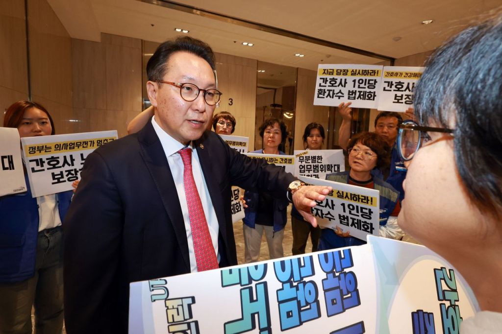 박민수 보건복지부 제2차관이 21일 서울 용산구 피크앤파크컨벤션에서 열린 '간호법 제정에 따른 진료지원업무 제도화 방안 공청회'에 참석하던 중 박 차관을 기다리며 피케팅하는 전국민주노동조합총연맹 공공운수노조 의료연대본부 조합원들을 만나 대화하고 있다. 연합뉴스