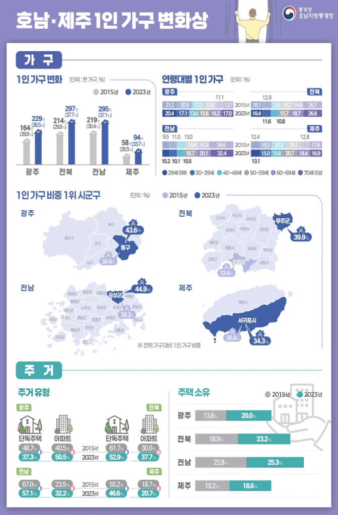 호남지방통계청이 22일 발표한 '호남·제주지역 1인 가구 변화상'에 따르면, 2023년 기준 광주의 1인 가구 비율은 전체 가구의 36.5%로 2015년보다 7.7%p 상승했다. 전북은 37.7%(7.9%p↑), 전남 37.1%(6.7%p↑), 제주 33.7%(7.2%p↑)로 모두 상승세를 보였다.