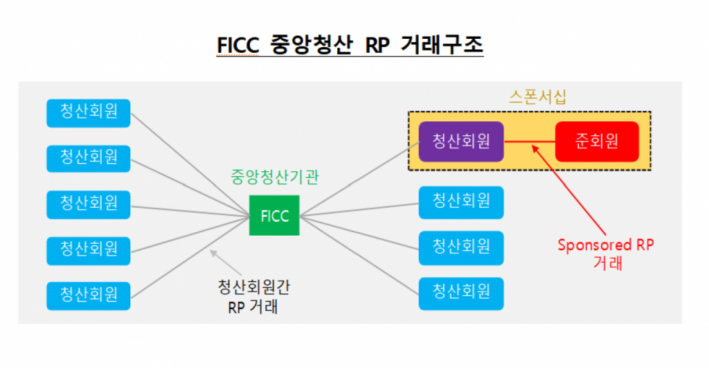 FICC는 미국 증권예탁결제기관(DTCC)의 자회사로, 회원들에 대해 미국 국채·정부기관채와 주택저당증권(MBS)의 청산 업무를 수행하는 기관이다. 후원 RP는 일반 RP와 달리 중앙청산을 통해 결제리스크를 줄이면서 유리한 금리 수준, 거래 규모 확대 등으로 수익성을 높일 수 있다. FICC의 준회원은 정회원인 청산회원과의 후원 RP 거래 시 중앙청산 서비스를 이용할 수 있다.