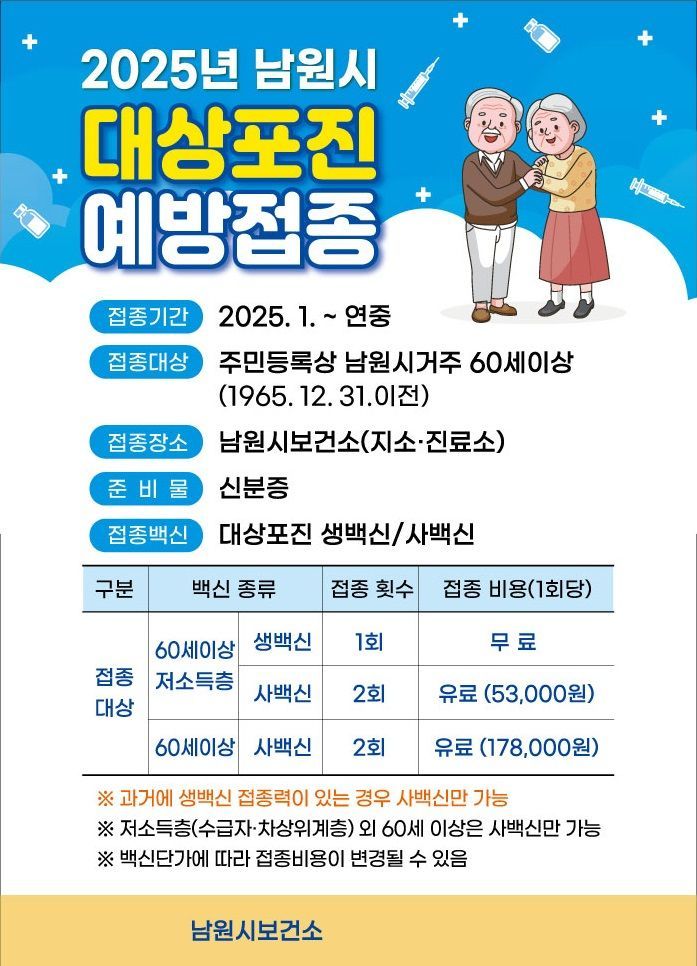 22일 보건소에 따르면 이번 접종은 시민들의 경제적 부담감을 해소하기 위해 추진됐으며 지원 대상은 주민등록상 남원시 거주 60세 이상 저소득층, 60세 이상 시민이다.