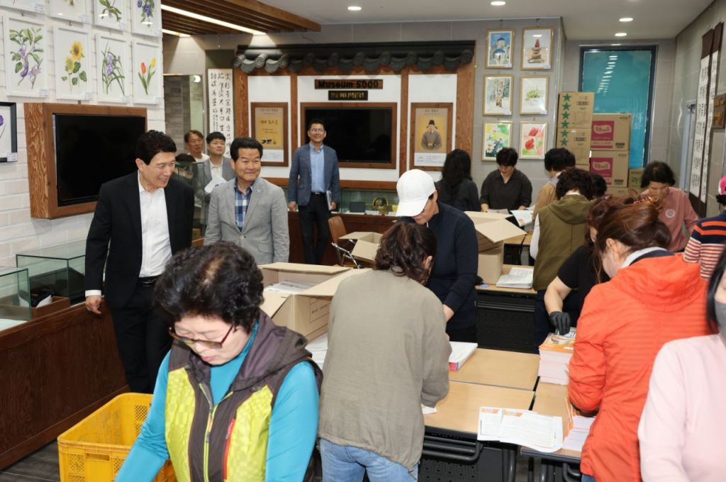 이강덕 시장은 22일 오천읍 행정복지센터를 방문해 선거 공보물 발송 작업에 구슬땀을 흘리고 있는 현장 직원들과 봉사자들을 찾아 격려했다. 포항시 제공