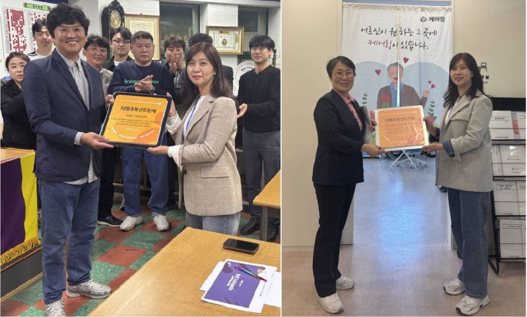 기장군치매안심센터 관계자가 기장읍청년회(좌측 사진)와 케어링(우측 사진)에 치매극복선도단체 지정패를 전달하고 있다. 기장군 제공