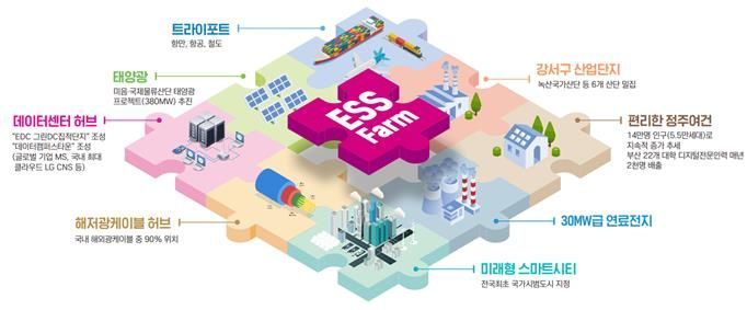 부산시는 해당 지역에 '신산업활성화형' 분산특구를 조성하고 대규모 '에너지저장장치(ESS) 팜'을 구축할 계획이다. ESS 팜은 수요자의 초기 투자부담과 시스템 효율성 문제를 해소하기 위한 원격지 분산형 모델이다. 저장된 전기를 가상상계거래를 통해 수요자에게 판매해 새로운 전력시장 모델을 구현한다.