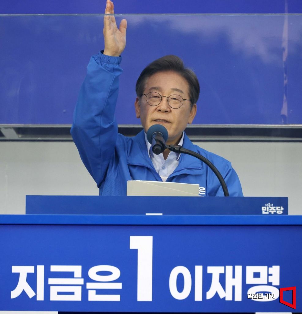 이재명 더불어민주당 대선후보가 21일 인천 계양역 광장에서 열린 유세에서 지지를 호소하고 있다. 2025.5.21 김현민 기자