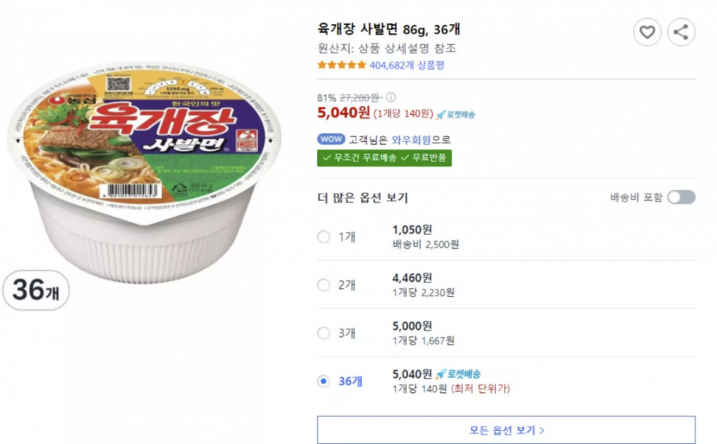 22일 유통업계에 따르면 전날 오후 11시께 쿠팡 판매사이트에 육개장 사발면 36개들이 상품이 5040원에 노출됐다. 개당 가격이 140원이다. 이는 기존에 판매되던 가격인 2만7000원~2만8000원보다 80%가량 저렴한 것이다.