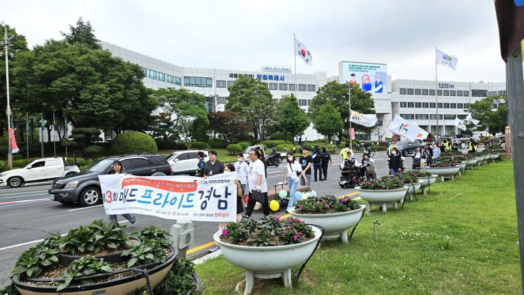 제3회 '매드 프라이드(Mad Pride)' 경남 행사 참가자들이 창원광장을 한 바퀴 도는 도보행진을 벌이고 있다. 이세령 기자