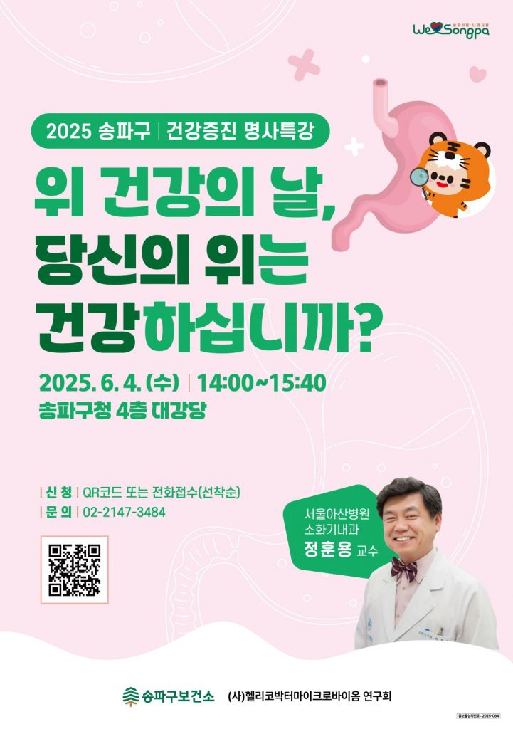 송파구 보건소와 (사)헬리코박터마이크로바이옴 연구회가 공동으로 특강을 마련했다. 대상은 건강에 관심이 있는 모든 지역주민이며 별도 참여비용은 없다. 참여 신청은 송파구보건소 건강증진과(02-2147-3484)로 전화하거나 QR코드를 통해 온라인으로 사전접수 하면 된다.